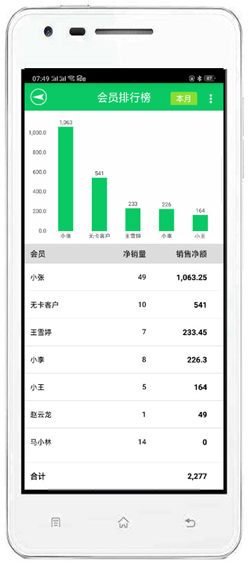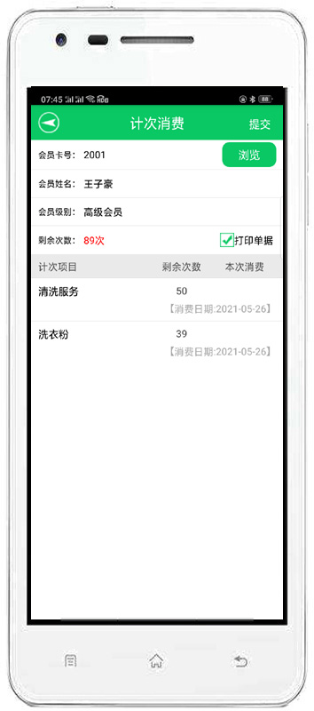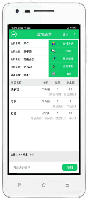 消費(fèi)開(kāi)單:對(duì)會(huì)員消費(fèi)情況進(jìn)行錄入,自動(dòng)完成累計(jì)積分,消費(fèi)打折。也可以增加會(huì)員消費(fèi)商品的詳細(xì)信息。