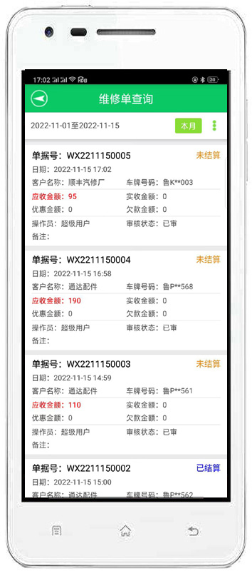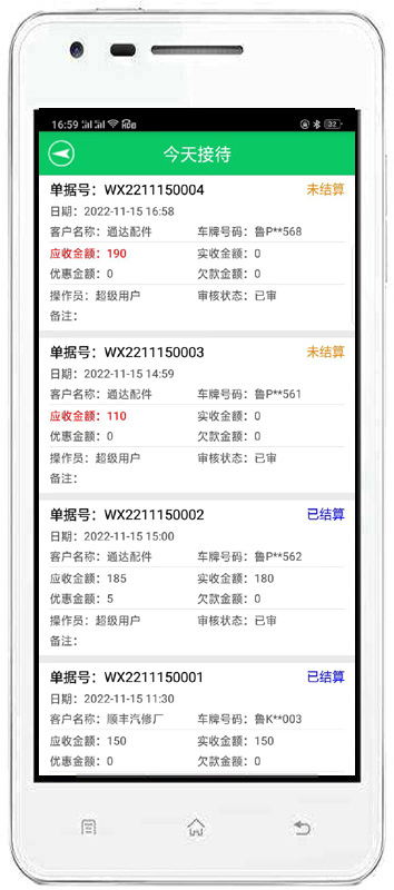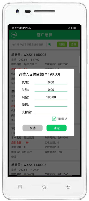 | 客戶結(jié)算:可能根據(jù)客戶進(jìn)行結(jié)算,也可以查詢單據(jù)號的方式進(jìn)行結(jié)算。完成對客戶未結(jié)算單據(jù)維修項目調(diào)整,客戶付款,對未結(jié)清單據(jù)進(jìn)行批量還款以及對未結(jié)清尾款進(jìn)行優(yōu)惠等操作。 | |||