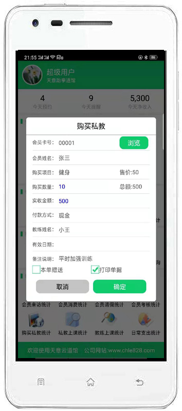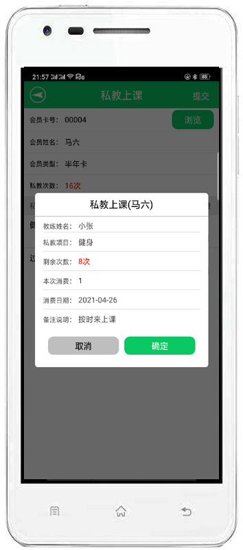 | 該功能可以對會員刷卡登記和會員消費店內(nèi)商品進行管理。同時也可以管理兌換商品、充值、私教。 |
