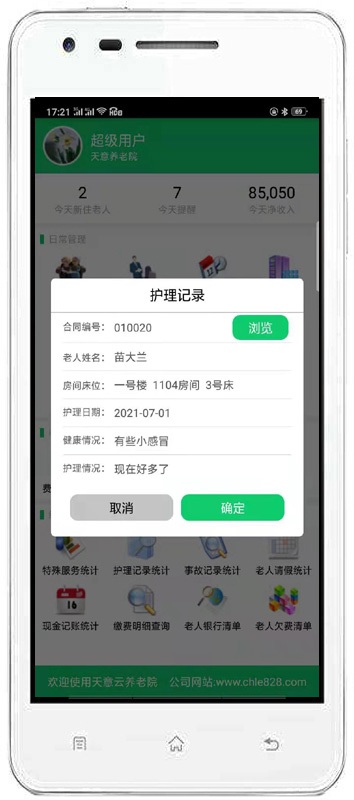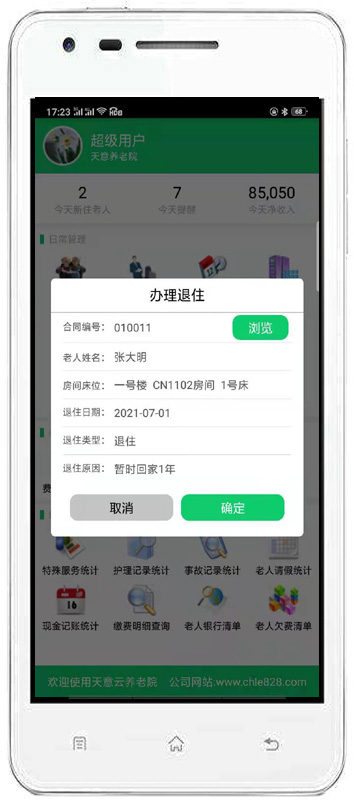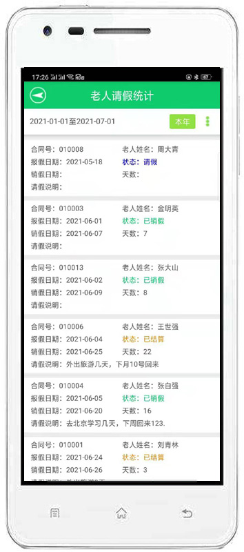 | 3、老人管理:主要包括入住管理、請(qǐng)假管理、特殊服務(wù)、辦理退住、護(hù)理記錄、事故記錄、生日提醒、媒介渠道對(duì)比等內(nèi)容。 | |||