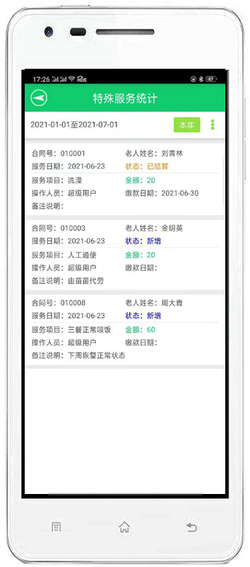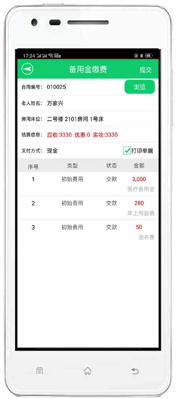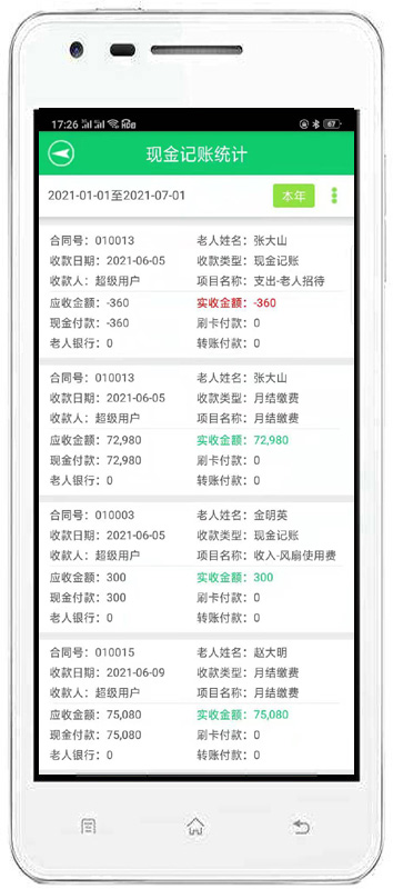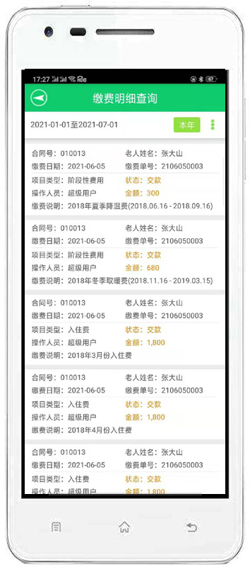 | 4、收費(fèi)管理:主要包括費(fèi)用結(jié)算及續(xù)費(fèi)、備用金繳費(fèi)、入住繳費(fèi)、退住結(jié)款、現(xiàn)金記賬、老人銀行清單、繳費(fèi)明細(xì)查詢、老人欠費(fèi)清單等內(nèi)容。 | |||