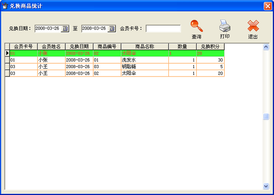| 2.6.4 兌換商品統(tǒng)計(jì): 功能 用于查詢本店會(huì)員在指定時(shí)間段內(nèi)兌換商品情況。 | |||