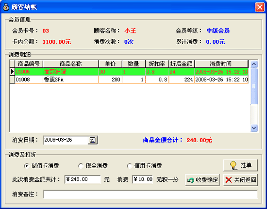 | 2.2 顧客結(jié)帳:功能 本模塊將自動(dòng)統(tǒng)計(jì)每位顧客在店時(shí)所發(fā)生的所有消費(fèi)額和應(yīng)付款額,并完成結(jié)帳收銀操作。 | |||