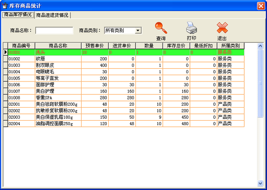 | ·點(diǎn)擊菜單“統(tǒng)計(jì)報(bào)表→庫存商品統(tǒng)計(jì)”進(jìn)入庫存商品統(tǒng)計(jì)界面。 ·進(jìn)入“商品庫存情況”窗口中,在“商品名稱”后的文本框中輸入想查詢的條件,在“商品類別”后的下拉框中選擇需要查詢的類別,點(diǎn)擊“查詢”按鈕即可在本窗口中的數(shù)據(jù)窗口中顯示出符合查詢條件的信息。點(diǎn)擊“打印”按鈕,可將當(dāng)前數(shù)據(jù)表中顯示的數(shù)據(jù)打印輸出到已連接并能正常工作的打印機(jī)上。點(diǎn)擊“退出”按鈕,退出本窗口。 ·進(jìn)入“商品進(jìn)退貨情況”窗口中,系經(jīng)統(tǒng)默認(rèn)顯示在數(shù)據(jù)表中的數(shù)據(jù)為當(dāng)天的進(jìn)退貨明細(xì)。可以選擇需要查詢“統(tǒng)計(jì)日期”的起始日期和截止日期,在“所屬類別”后的下拉框中選擇需要查詢的類別,在“商品名稱”后的文本框中輸入想查詢的條件,點(diǎn)擊“查詢”按鈕即可在本窗口中的數(shù)據(jù)窗口中顯示出符合查詢條件的信息。點(diǎn)擊“打印”按鈕,可將當(dāng)前數(shù)據(jù)表中顯示的數(shù)據(jù)打印輸出到已連接并能正常工作的打印機(jī)上。點(diǎn)擊“退出”按鈕,退出本窗口。 |