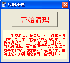| 2.7.5 數(shù)據(jù)清理: 功能 本功能清除顧客開單、顧客消費(fèi)、結(jié)帳單、掛帳單、臺(tái)位預(yù)訂等信息,系統(tǒng)基本信息不在清理范圍,如需清除請(qǐng)用戶自行刪除。 | |||