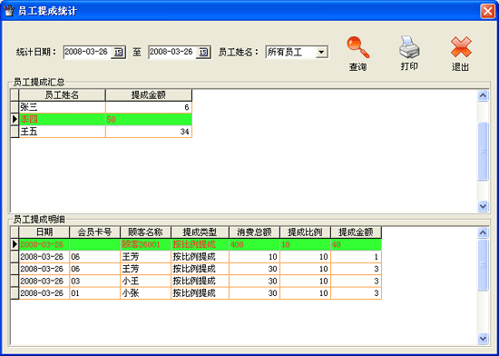 | ·點(diǎn)擊菜單“統(tǒng)計(jì)報(bào)表→員工提成統(tǒng)計(jì)”進(jìn)入員工提成統(tǒng)計(jì)界面。 ·進(jìn)入“員工提成統(tǒng)計(jì)”窗口中,系經(jīng)統(tǒng)默認(rèn)顯示在數(shù)據(jù)表中的消費(fèi)數(shù)據(jù)為當(dāng)天的員工提成情況。可以選擇需要查詢“統(tǒng)計(jì)日期”的起始日期和截止日期,在“員工姓名”后的下拉框中選擇需要查詢的員工,點(diǎn)擊“查詢”按鈕即可在本窗口中的數(shù)據(jù)窗口中顯示出符合查詢條件的信息。點(diǎn)擊“打印”按鈕,可將當(dāng)前數(shù)據(jù)表中顯示的數(shù)據(jù)打印輸出到已連接并能正常工作的打印機(jī)上。點(diǎn)擊“退出”按鈕,退出本窗口。 |