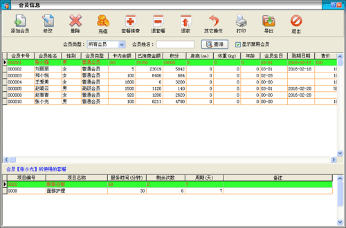 | 包括會(huì)員基本信息、本卡售價(jià)、銷售員工、使用套餐、皮膚狀況、護(hù)理計(jì)劃、會(huì)員照片等信息。