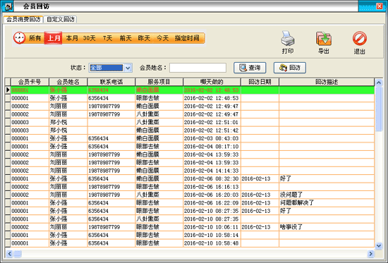 | 回訪包括兩種,一種是對(duì)已做過護(hù)理的的顧客進(jìn)行回訪,另外一種是自定義的回訪。 消費(fèi)回訪