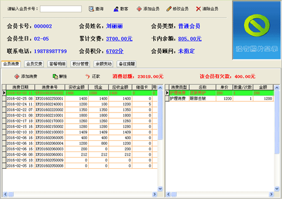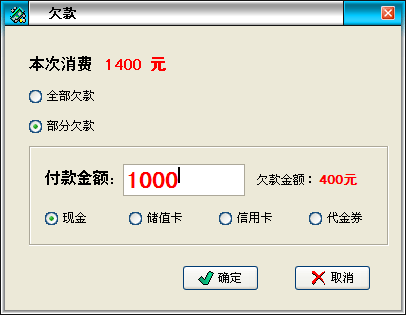 掛單功能:這個(gè)會(huì)員可能當(dāng)時(shí)沒有立即結(jié)賬,下次刷卡后打開增加消費(fèi)窗口會(huì)直接彈出上次臨時(shí)保存的消費(fèi)記錄。 欠款功能:欠款可以選擇部分欠款或全部欠款,這是處理消費(fèi)欠款的一種解決辦法。