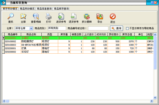 在進(jìn)貨管理中點(diǎn)擊“當(dāng)前庫存查詢”按鈕打開庫存查詢窗口: