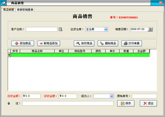 點(diǎn)擊銷售管理的“商品銷售”按鈕打開商品銷售窗口: