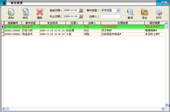 ·用來(lái)登記當(dāng)天保安巡邏過(guò)程中小區(qū)內(nèi)出現(xiàn)的一些治安事件,及時(shí)登記,及時(shí)處理,對(duì)加強(qiáng)小區(qū)治安管理,保證業(yè)主安全,也便于日后對(duì)一些事件的查詢。 |