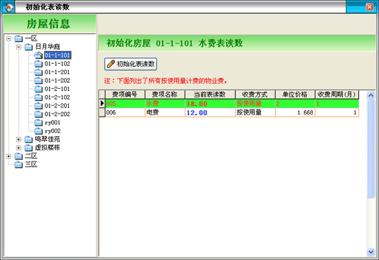 ·初始化表讀數(shù)是對(duì)儀表類物業(yè)費(fèi)主要是按表的走量需要計(jì)算的那些進(jìn)行初始設(shè)置,如:水費(fèi)、電費(fèi)等,它是業(yè)主入住后進(jìn)行設(shè)定。錄入相應(yīng)費(fèi)用后,盡量不要對(duì)讀數(shù)進(jìn)行修改,以免造成走表數(shù)據(jù)的混亂。請(qǐng)慎用此功能。 |