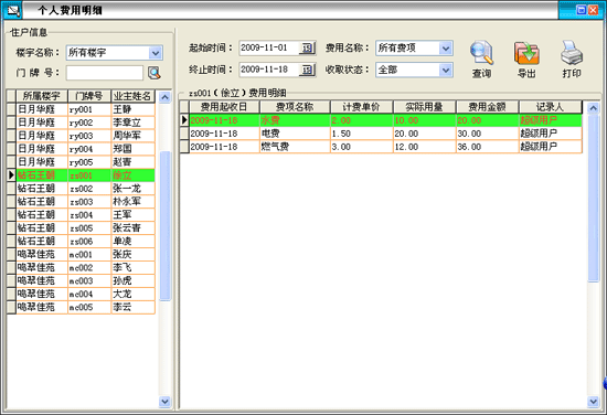 ·個(gè)費(fèi)用明細(xì)用來(lái)查詢單個(gè)業(yè)主在一段時(shí)間內(nèi)的物業(yè)費(fèi)明細(xì),可分別查詢一段時(shí)間內(nèi)業(yè)主的未交物業(yè)費(fèi)、已交物業(yè)費(fèi)和所有以交未交的物業(yè)費(fèi)。對(duì)查詢結(jié)果可以打印導(dǎo)出。 |
