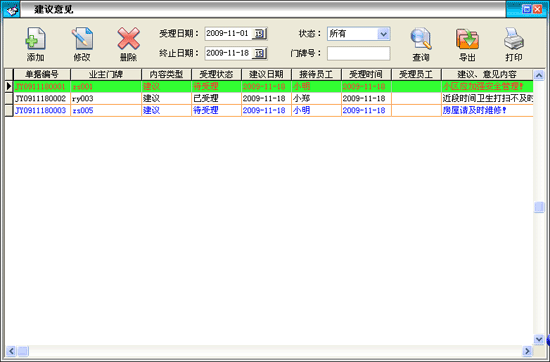 ·可在此窗口進(jìn)行建議意見(jiàn)的添加、修改、刪除等操作,管理人員在此可記錄業(yè)主提出的一些建議和意見(jiàn)并對(duì)這些建議和意見(jiàn)進(jìn)行跟蹤反饋,為健全物業(yè)管理工作提供了業(yè)主與物業(yè)管理互動(dòng)的平臺(tái)。 |