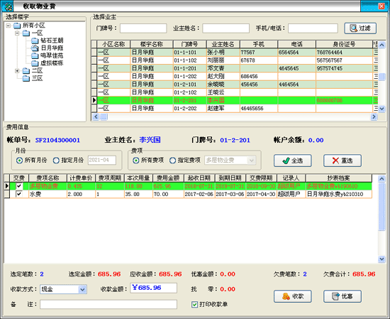 | 第七步:進(jìn)入“收費(fèi)管理-->收取物業(yè)費(fèi)”,收取相應(yīng)業(yè)主的物業(yè)費(fèi)。 | |||