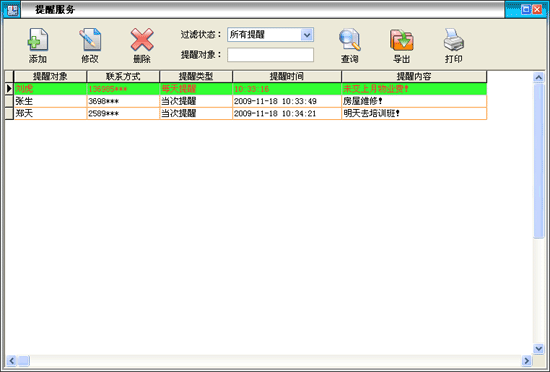 ·可以在此窗口進(jìn)行提醒服務(wù)的添加、修改、刪除等操作,管理人員可根據(jù)自已的需要添加一些定期彈出提醒的信息,以免忘做一些重要的工作,避免不必要的麻煩。 |