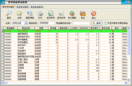 庫存查詢窗口共分兩部分,一是庫存變動查詢,另一個是商品變動查詢。在庫存變動查詢中列表中顯示的是庫存商品的信息比如庫存數(shù)量,庫存成本價,庫存總價等,在“商品編號或名稱”后輸入商品編號或商品名稱來查詢相應(yīng)商品的庫存信息。點(diǎn)擊“查詢”按鈕打開查詢窗口,在窗口中選擇相應(yīng)的條件更準(zhǔn)確的查詢庫存。點(diǎn)擊“全部”按鈕會列出所有庫存中的商品。點(diǎn)擊“查看明細(xì)”按鈕打開明細(xì)窗口: