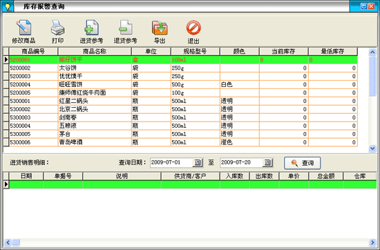在商品信息這一部分輸入新增商品的所有信息,點(diǎn)擊“保存”按鈕即可把該商品保存到右邊的已存商品中,保存后可以繼續(xù)輸入下一種商品。如果商品增加完后可以直接點(diǎn)“退出”按鈕。退出增加商品窗口后會在商品列表中看剛才增加的商品。如果要修改商品,先選中要修改的商品,點(diǎn)擊“修改”按鈕打開商品修改界面,在商品修改界面中修改相應(yīng)的信息點(diǎn)擊“保存”即可。點(diǎn)擊“刪除”按鈕即可以把選中的商品刪除,該商品發(fā)生過業(yè)務(wù)則是不能刪除的。