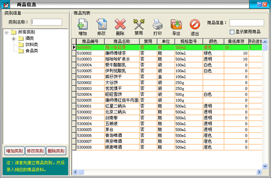 在商品信息窗口中左邊是商品類別,右邊列表中是該類別對應(yīng)的商品?梢孕略鲱悇e,重命名和刪除類別。新增的類別是屬于所選類別的下一級,如果類別下有商品存在則該類別是不能被刪除的。在類別名稱后的文本框中可以輸入類別名稱或類別簡碼來查詢需要的類別。