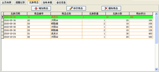 ·選中要兌換的商品,輸入兌換數(shù)量(系統(tǒng)默認(rèn)為1),點擊“增加”按鈕即可把商品添加到已選商品欄中。如果兌換商品的數(shù)量是1,也可以在兌換商品清單中雙擊該商品來添加已選商品。已選商品中的“刪除”按鈕是用來刪除已選商品欄中的商品。點擊“保存”按鈕保存已選商品!胺祷亍卑粹o放棄兌換商品,返回兌換商品窗口。保存完成后系統(tǒng)將自動將會員折扣卡上的積分減去兌換商品所需的分?jǐn)?shù),如果卡內(nèi)積分不夠?qū)⒉荒軆稉Q商品。保存完成后會員兌換商品窗口中看到剛才增加的兌換商品的信息,可以點擊“修改商品”按鈕對兌換商品信息修改。點擊“刪除商品”按鈕刪除選中的商品。 |