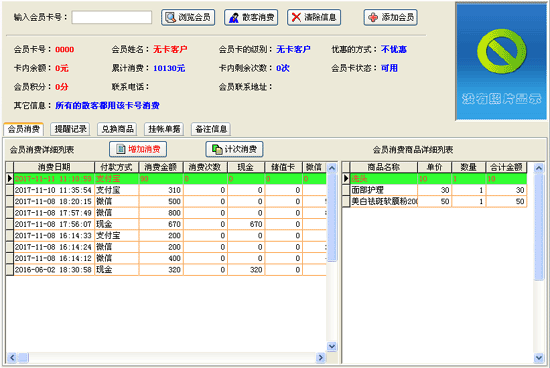 會員消費:對會員消費情況進行錄入,自動完成累計積分,消費打折。也可以增加會員消費商品的詳細(xì)信息。
