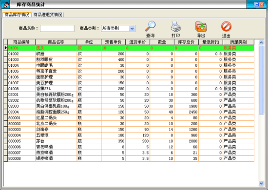 | ·點擊菜單“統(tǒng)計報表→庫存商品統(tǒng)計”進入庫存商品統(tǒng)計界面。 ·進入“商品庫存情況”窗口中,在“商品名稱”后的文本框中輸入想查詢的條件,在“商品類別”后的下拉框中選擇需要查詢的類別,點擊“查詢”按鈕即可在本窗口中的數(shù)據(jù)窗口中顯示出符合查詢條件的信息。點擊“打印”按鈕,可將當(dāng)前數(shù)據(jù)表中顯示的數(shù)據(jù)打印輸出到已連接并能正常工作的打印機上。點擊“退出”按鈕,退出本窗口。 ·進入“商品進退貨情況”窗口中,系經(jīng)統(tǒng)默認(rèn)顯示在數(shù)據(jù)表中的數(shù)據(jù)為當(dāng)天的進退貨明細(xì)?梢赃x擇需要查詢“統(tǒng)計日期”的起始日期和截止日期,在“所屬類別”后的下拉框中選擇需要查詢的類別,在“商品名稱”后的文本框中輸入想查詢的條件,點擊“查詢”按鈕即可在本窗口中的數(shù)據(jù)窗口中顯示出符合查詢條件的信息。點擊“打印”按鈕,可將當(dāng)前數(shù)據(jù)表中顯示的數(shù)據(jù)打印輸出到已連接并能正常工作的打印機上。點擊“退出”按鈕,退出本窗口。 |
