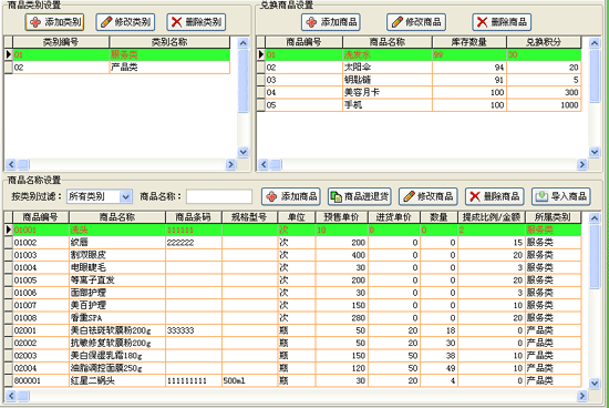| ·商品類別設(shè)置:根據(jù)商品的屬性分為不同的類別。點擊“添加類別”按鈕可以添加所需類別,點擊“修改類別”按鈕修改相應(yīng)類別。 其中“服務(wù)類”為系統(tǒng)類別是不能修改和刪除的。 ·商品設(shè)置:主要設(shè)置商品所屬的類別、商品編號、商品名稱、預(yù)設(shè)單價、進貨單價、商品數(shù)量、打折比率。 ·兌換商品設(shè)置:兌換商品主要用于折扣卡。會員折扣卡可以根據(jù)卡內(nèi)的積分來兌換商品,兌換完商品系統(tǒng)將自動減去兌換商品所需的分?jǐn)?shù)。 |