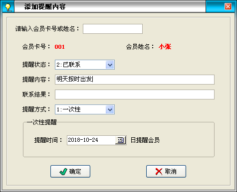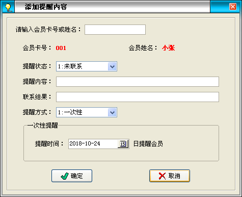 ·刪除提醒內(nèi)容:點擊“刪除提醒內(nèi)容”可以刪除不再需要提醒的會員。 ·提醒內(nèi)容過濾:點擊“提醒內(nèi)容過濾”按鈕打開過濾提醒窗口。選擇要查詢的提醒條件,點擊“確定”按鈕進行內(nèi)容過濾,點擊“取消”按鈕取消本次操作。 |