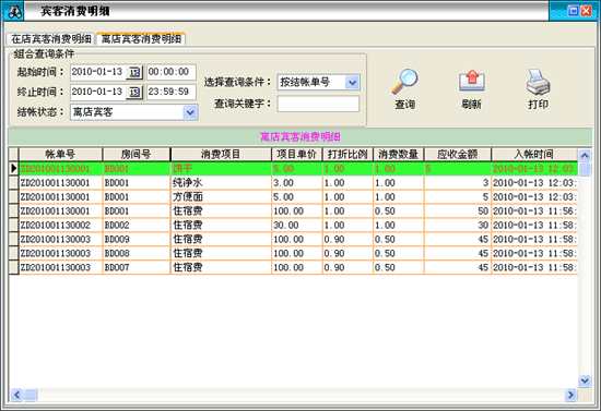 此模塊用來查詢在店/離店消費(fèi)賓客已記錄在冊的消費(fèi)清單(一般根據(jù)賓客的要求或某種特殊需要會用到此模塊)。