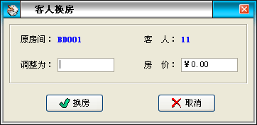 假如因?yàn)榈陜?nèi)原因或客人要求,造成客人當(dāng)前占用的房間(房間)必須終止提供,但客人的消費(fèi)并未終結(jié),為此,可以通過更換房間來將客人資料及消費(fèi)信息在不進(jìn)行結(jié)帳操作的情況下轉(zhuǎn)到另一新項(xiàng)目下。例如:換房間(房間)。