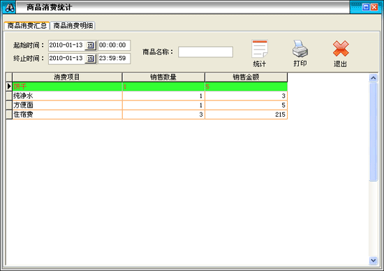 ·點(diǎn)擊菜單“營業(yè)查詢→商品消費(fèi)統(tǒng)計(jì)”進(jìn)入“商品消費(fèi)統(tǒng)計(jì)”界面。 |