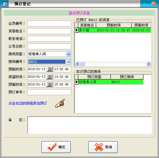 此項(xiàng)功能可以完成增加預(yù)訂、修改預(yù)訂、刪除預(yù)訂,預(yù)訂情況的查詢、打印等功能。