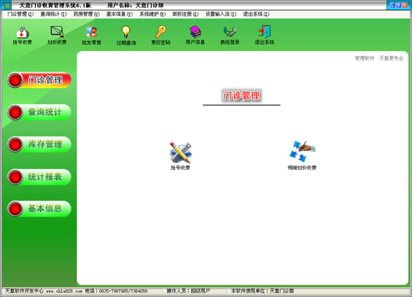 天意門診收費管理系統(tǒng)是一款專業(yè)的門診收費管理軟件,具有門診劃價收費、藥品進銷存管理、醫(yī)生及科室工作量統(tǒng)計、藥品庫存及有效期報警管理等功能。天意門診收費管理系統(tǒng)符合GSP管理規(guī)范,界面設(shè)計簡潔美觀,其人性化的軟件流程,使普通用戶不需培訓也能很快掌握軟件操作使用方法。強大報表與集成查詢功能是本軟件的特色,所有功能在用戶需要使用的地方自然體現(xiàn)。軟件真正從用戶需求出發(fā),為基層醫(yī)院、鄉(xiāng)鎮(zhèn)衛(wèi)生院、私立醫(yī)院、企業(yè)職工醫(yī)院、社區(qū)衛(wèi)生服務中心、門診、診所、衛(wèi)生室等量身打造,是您進行門診收費信息化管理的強大工具。 |