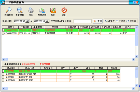 在窗口中的“單據(jù)號(hào)”后的文本框中輸入進(jìn)貨單或退貨單的單據(jù)號(hào)、原始單號(hào)進(jìn)行查詢。上邊的列表中顯示的是所查詢到的單據(jù),下邊的列表中顯示的是該單據(jù)對(duì)應(yīng)的詳細(xì)情況。點(diǎn)擊“查詢”按鈕打開查詢窗口: