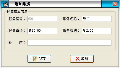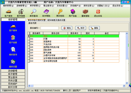 | 在‘維修設(shè)置’中‘服務(wù)信息及提成設(shè)置’頁面中添加、修改服務(wù)信息,如圖所示: