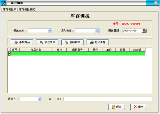 | 在庫存管理中點(diǎn)擊"庫存調(diào)撥"按鈕,打開窗口: