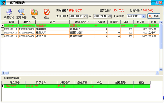 庫存查詢窗口共分兩部分,一是庫存變動(dòng)查詢,另一個(gè)是商品變動(dòng)查詢。在庫存變動(dòng)查詢中列表中顯示的是庫存商品的信息比如庫存數(shù)量,庫存成本價(jià),庫存總價(jià)等,在“商品編號(hào)或名稱”后輸入商品編號(hào)或商品名稱來查詢相應(yīng)商品的庫存信息。點(diǎn)擊“查詢”按鈕打開查詢窗口,在窗口中選擇相應(yīng)的條件更準(zhǔn)確的查詢庫存。點(diǎn)擊“全部”按鈕會(huì)列出所有庫存中的商品。點(diǎn)擊“查看明細(xì)”按鈕打開明細(xì)窗口: