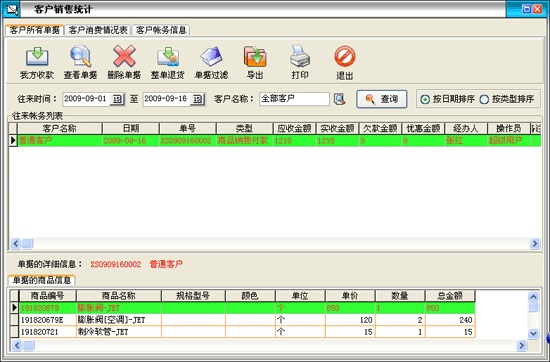 在往來帳務(wù)窗口中共分為三部分:客戶所有單據(jù)、客戶銷售情況、客戶帳務(wù)。 |