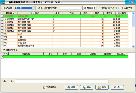 在‘增加維修信息’窗口中,輸入項(xiàng)目單價(jià)和數(shù)量,以及該配件的銷售員工或服務(wù)的服務(wù)員工!