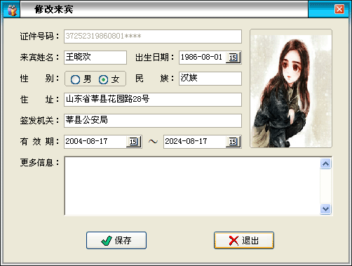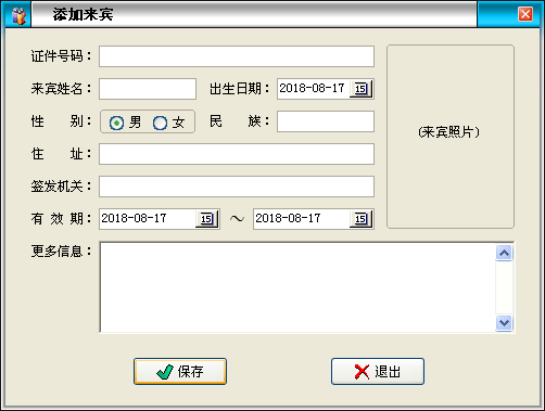 依次輸入:證件號(hào)碼、來(lái)賓姓名、出生日期、性別、民族、住址、簽發(fā)機(jī)關(guān)、有效期、備注信息,點(diǎn)擊“保存”按鈕即可。 |