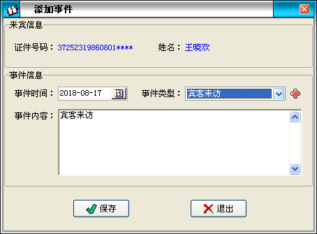 | 2.1.2.2 添加事件:除了系統(tǒng)默認(rèn)賓客來(lái)訪事件外,用戶也可以自定義事件,并添加事件記錄,點(diǎn)擊“添加事件”按鈕彈出如下窗體: