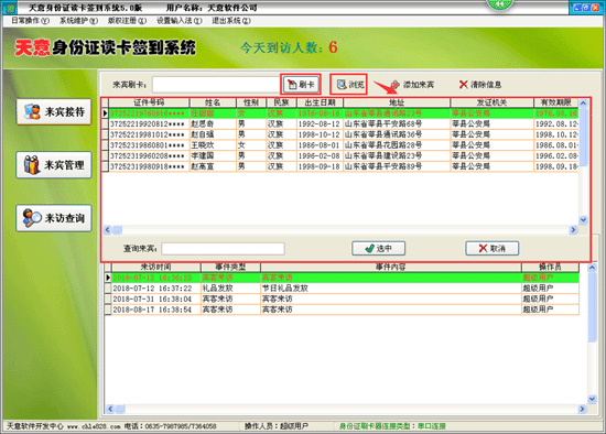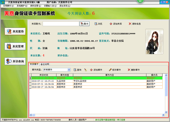 | 來(lái)賓接待:對(duì)來(lái)賓用戶進(jìn)行自動(dòng)刷卡登記,也可根據(jù)實(shí)際情況自動(dòng)記錄來(lái)賓的其它事件行為;可以手動(dòng)添加、修改、刪除來(lái)賓信息,也可以添加、修改、刪除來(lái)賓事件操作。 系統(tǒng)管理:本軟件支持國(guó)內(nèi)所有正規(guī)廠家生產(chǎn)的二代身份證讀卡器具進(jìn)行讀卡操作,也可以進(jìn)行來(lái)賓信息管理及來(lái)賓事件記錄的查詢、統(tǒng)計(jì)、導(dǎo)出、打印等操作。本軟件支持使用國(guó)內(nèi)所有正規(guī)廠家生產(chǎn)的二代身份證讀卡器。有的廠家生產(chǎn)的設(shè)備,需要把該廠家提供的設(shè)備授權(quán)文件放在C盤根目錄下,才能正常讀取二代身份證照片信息。一般在設(shè)備附帶的驅(qū)動(dòng)資料光盤中提供有該授權(quán)文件,授權(quán)文件后綴一般為.dat或.Lic。 |