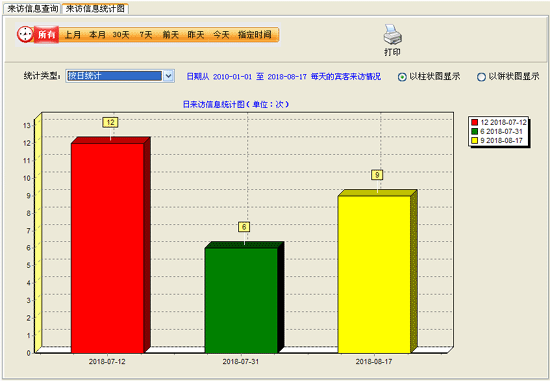 可以根據(jù)不同的統(tǒng)計(jì)類型,如按月統(tǒng)計(jì)、按日統(tǒng)計(jì)、按事件發(fā)生頻度排行統(tǒng)計(jì)賓客來(lái)訪記錄,并以柱狀圖或曲線圖的方式顯示。