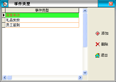 在該界面中可以自定義的事件類型,點(diǎn)擊添加按鈕添加事件類型,點(diǎn)擊刪除按鈕刪除選中的事件類型,注意:“賓客來(lái)訪”為系統(tǒng)默認(rèn),用戶不能刪除。 |