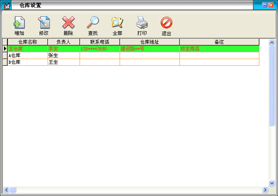 在基本設置模塊中點擊“倉庫設置”按鈕打開倉庫設置窗口。在窗口中可以看到所有的倉庫。點擊“增加”按鈕打開增加倉庫窗口,輸入倉庫的信息,倉庫名稱不能重復。點擊“修改”按鈕可以修改選中的倉庫信息。點擊“刪除”按鈕可以刪除選中的倉庫。點擊“查找”按鈕打開倉庫查詢窗口,輸入相應的條件查詢不同的倉庫信息。點擊“全部”按鈕可以列出所有的倉庫信息。