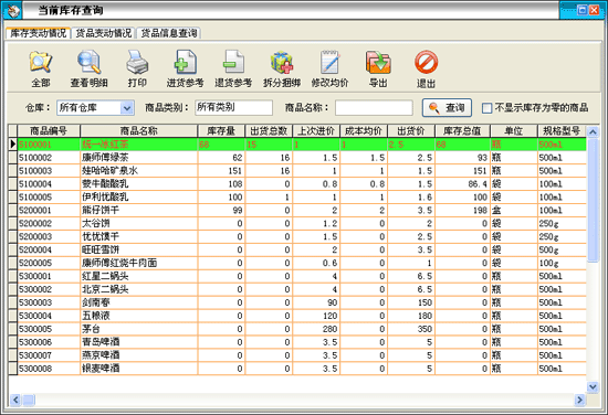 在進貨管理中點擊“當前庫存查詢”按鈕打開庫存查詢窗口: