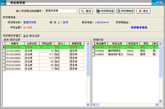 供貨商供貨情況:以表格形式在'進貨/退貨記錄'欄內顯示我方與當前供貨商發(fā)生的貨品入庫、退貨記錄,在'詳細內容'欄內顯示相應'進貨'或'退貨'記錄所對應的詳細