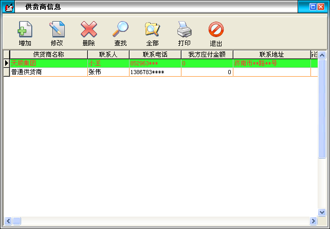 在基本設置模塊中點擊“供貨商信息”按鈕打開供貨商信息窗口。在窗口中可以看到所有的供貨商。點擊“增加”按鈕打開增加供貨商窗口,輸入供貨商的信息,供貨商名稱不能重復。如果該供貨商有期初金額就在“期初應收”后輸入相應的金額。點擊“修改”按鈕可以修改選中的供貨商信息。點擊“刪除”按鈕可以刪除選中的供貨商,如果該供貨商有業(yè)務發(fā)生則不能刪除。系統(tǒng)有一個“普通供貨商”是不能被刪除的。點擊“查找”按鈕打開供貨商查詢窗口,輸入相應的條件查詢不同的供貨商信息。點擊“全部”按鈕可以列出所有的供貨商信息。