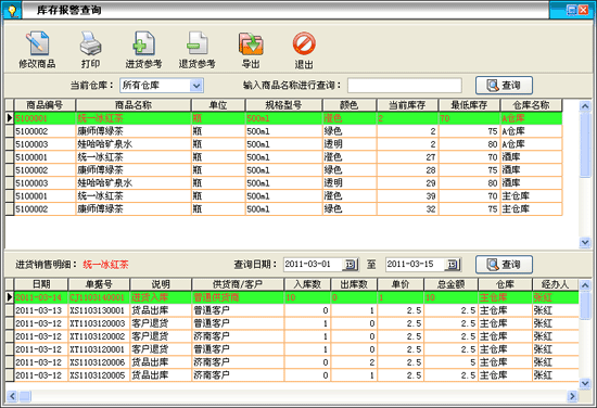 ·供貨商商品出貨情況顯示某個供貨商提供的商品的出貨情況,在列表中可以清楚的看出供貨商的商品出貨的數(shù)量,金額和庫存量。